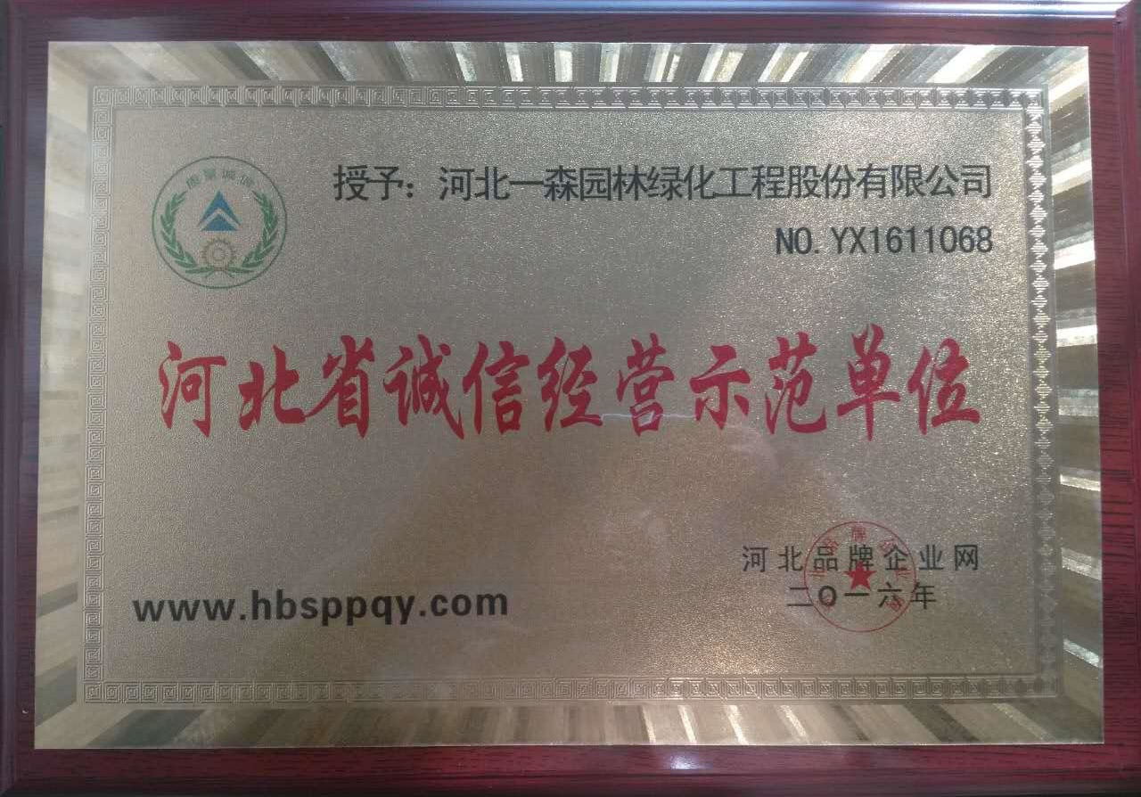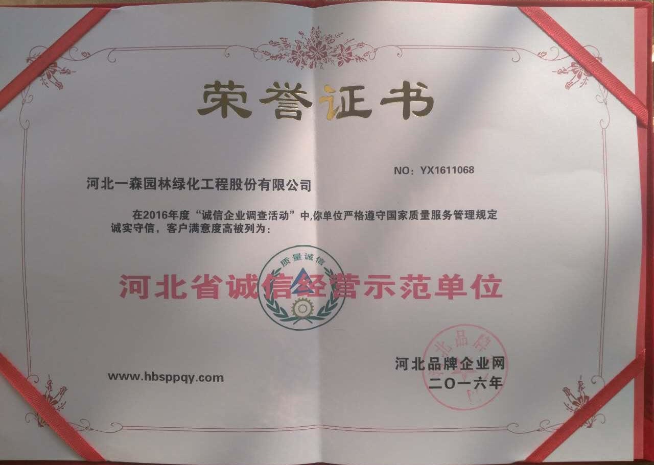 在2016年度“誠信企業調查活動”中,河北一森園林綠化工程股份有限公司嚴格遵守國家質量服務管理規定誠實守信,客戶滿意度高,被評為“河北省誠信經營示范單位”。